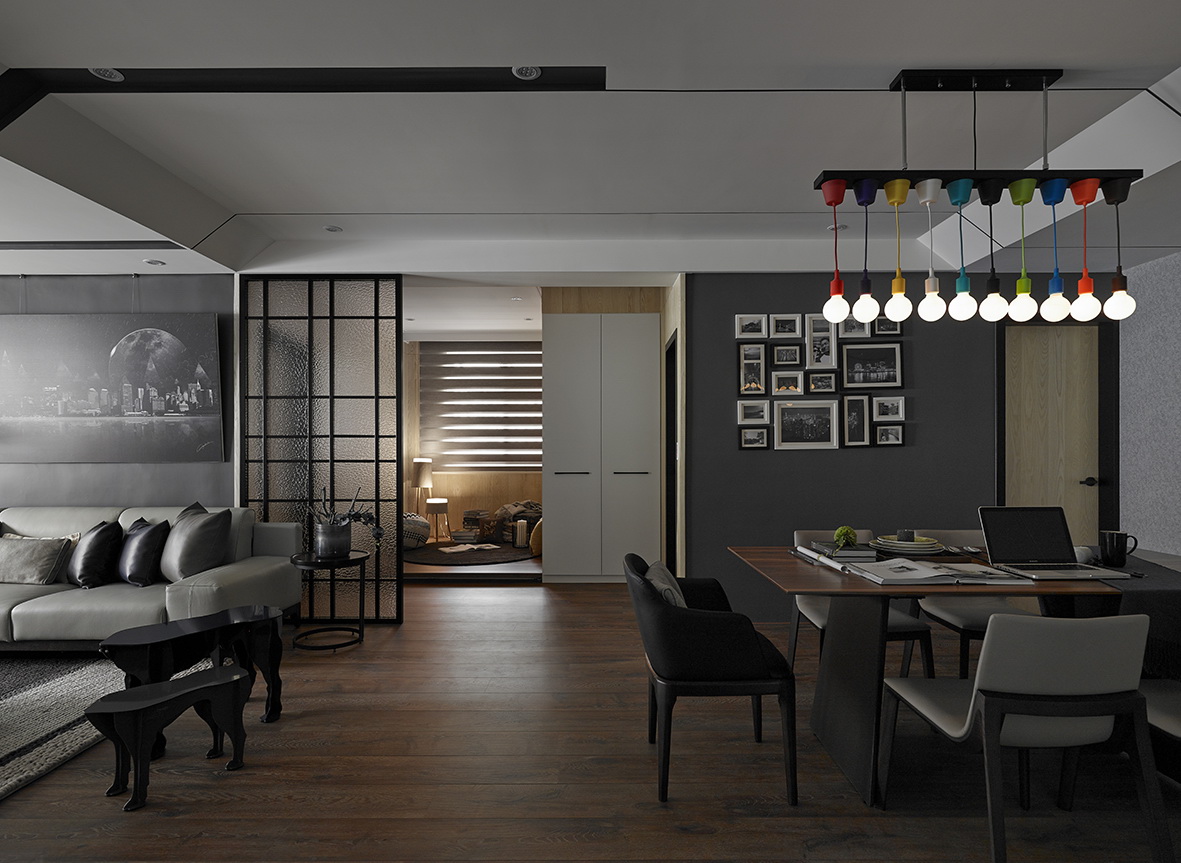 K HOUSE的公共空間使用長虹玻璃、鐵件、紋理明確的木皮與編織毯等較具現代情調的材質來裝飾,並以一「ㄇ」字型的鐵件造型貫穿玄關、客廳、餐廳多個空間,直至主臥房門口,凸顯了空間的向性與線性特質,也彰顯設計團隊對於室內空間的要求與堅持。