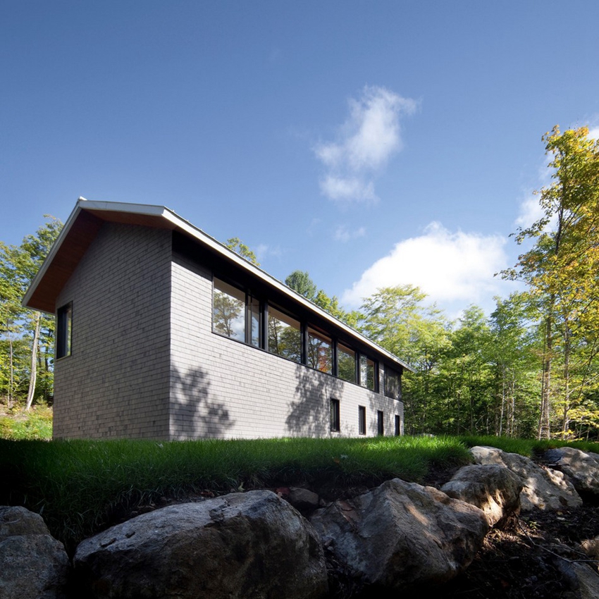 據建築師表示,設計策略是將白天的活動(餐廳,廚房,客廳,玄關)一同安排在上層樓,如此一來能充分欣賞周邊風景及運用到自然光。房間經過仔細規劃,沿東南邊依序排列成全景行列,結束於門廊處。教堂式的天花板提供了二樓廣敞的空間感。寬闊的公共區域裡頭,兩處雪松柱分隔了空間。第一處嵌有鋼壁爐。第二處遮蔽了機能性空間:廚房,儲藏室,清洗室。而橙色點亮屋內的溫暖回憶。
