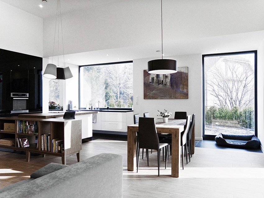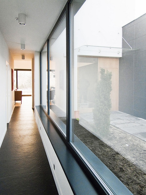 房子的中心是共同的生活空間,藉由在簡單的幾何結構中向上拉高做為特色。同時也與房子內外部的石板外觀做區隔。附加的多功能乒乓球室,位於內部延伸區域。屋子的平面配置由不同區域畫分為父母和子女區,以保持雙方的隱私。所有的臥室都藉由浴室和存儲藏空間做區隔。