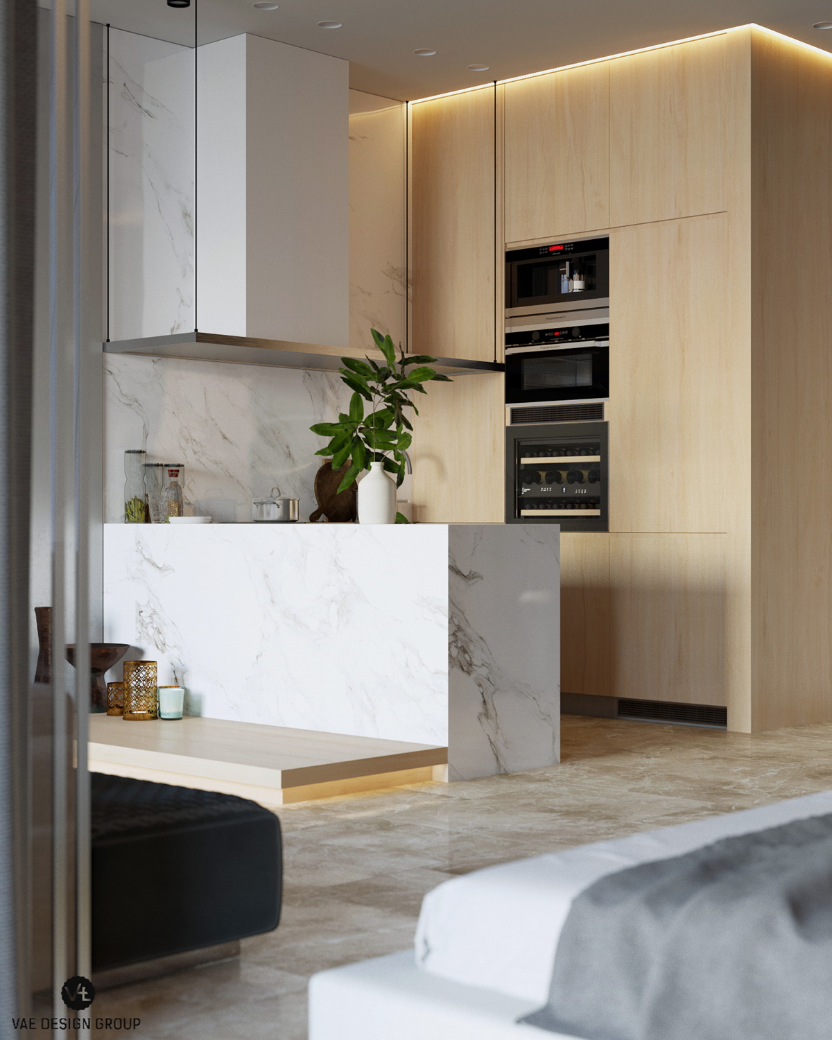 位於東歐喬治亞共和國(Georgia)一間只有17坪大的公寓內,住著一對雙收入的年輕夫妻。整個空間格局沒有過於明顯的界定,而是利用半開放的活動式拉門簡易的劃分公、私領域的界線,一整面的寬格狀玻璃愉悅的迎接陽光懷繞於此,明亮的環境中再添加窗邊看似懸浮的微高地面,串連至主牆面與吧檯行成「ㄇ」字型的置物、休憩區域,與所有家具一致的輕盈,讓穿透感巧妙地擴張視覺效果。主要建材以自然界美麗的元素,大理石、板岩及木材的光澤強調整個空間質感,簡約時尚的氛圍顯而易見。