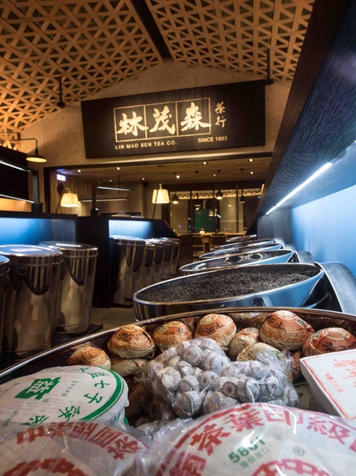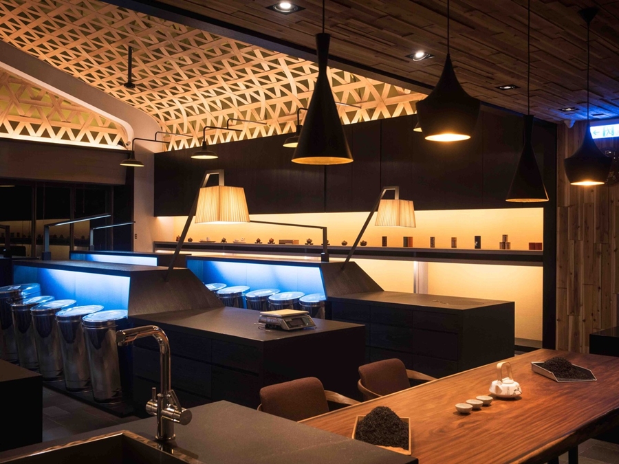位於台北的林茂森茶行,由外觀就能看見大大的木製匾額,體現東方讚揚文化的意象,內部柔和的燈光搭配木紋的主架構,顯得平靜而沉穩。而與外觀相呼應的天花,像是編織竹籃般大器的交錯著濃厚的古樸風味,向兩側牆面延伸下去呈現木質色調的深淺、豐富的天然紋理,以對稱之姿調節著空間的和諧概念,參訪者的動線有條有理且環環相通,完美呈現傳統茶農間的情感交流,明亮隨著層次或近或遠照映出多變的樣貌,再輔以日光燈照射著孔雀藍與芥末黃的壁面,點綴顏色的豐富表情,將滿滿的東方氣息,帶入美學人文的視覺享受。
