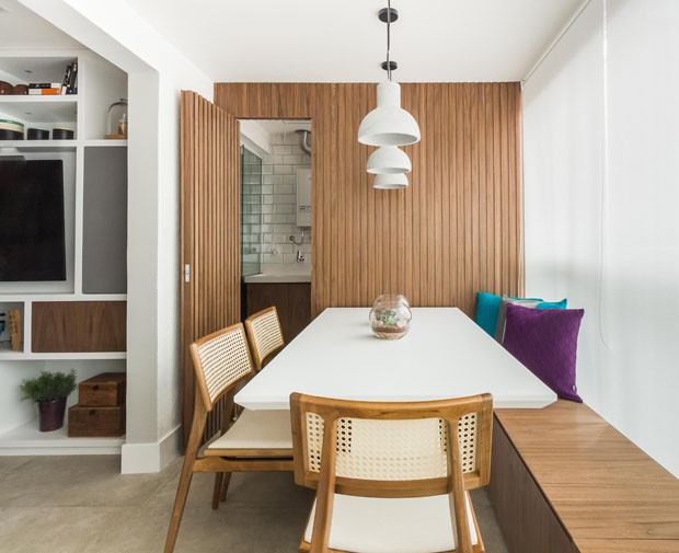 人們眼中正直、穩重的律師會是住在什麼樣的家呢?位於巴西聖保羅有一處17坪小公寓,採用大量胡桃木做主題,再輔以深灰色與藍色的家飾軟件作點綴,完美表現職業的穩重特色與個人喜好的反差,饒富趣味。壁面選用鏡子延伸視覺,正好與面外的一整排窗戶形成折射,增添室內明亮感。