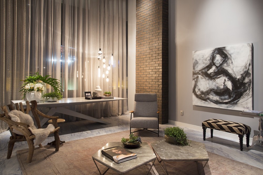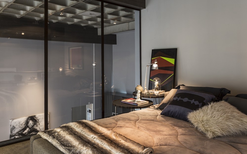 公寓空間規劃包含入口大廳、餐廳、廚房、臥室及兼具起居室功能的書房。寬敞的客廳,正對著兩面高聳的主窗前,使得此處只要在白天,必定是光采明亮。而廚房及餐廳的位置,正好就在公寓夾層的下方,相當程度的保有了用餐的私密需求。公共領域設計上,偏向奢華且現代,強大的藝術性拼貼,將毛料、皮革等材質運用得淋漓盡致。