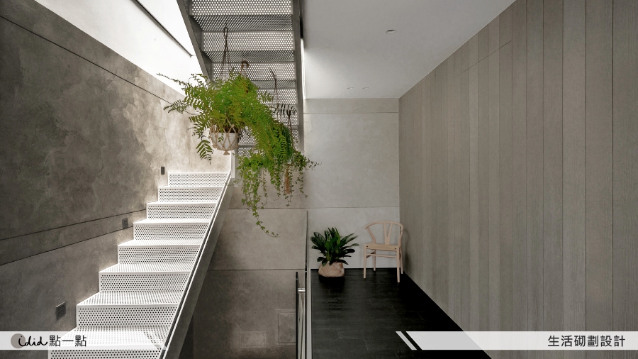 同時於空間內側無臨窗的樓梯頂方開設天井,階梯選擇白色沖孔板架構。
