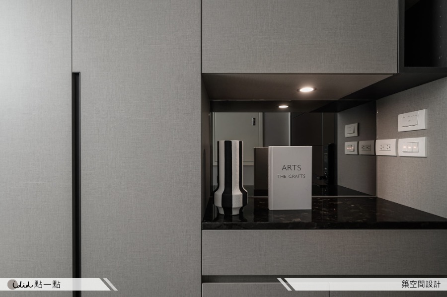 在建材的選擇上,實木皮、系統櫃、以及玻璃等高質感建材得以充分發揮。櫃體從地板到天花板的完美鋪設,打造出方正平整的空間,不僅實用且美觀。這樣的建材選擇使整個室內散發著溫暖的自然風情。