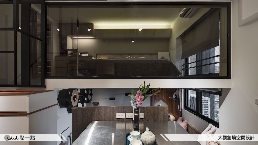 上層的空間規劃為臥室、更衣室、閱讀區,並以透明玻璃拉門作為場域界限,營造出通透感,也方便觀察寵物的動向。經過設計師的創意巧思,這10坪的夾層小宅,既舒適美感又符合實際生活所需,相信喵星人也喜歡。
