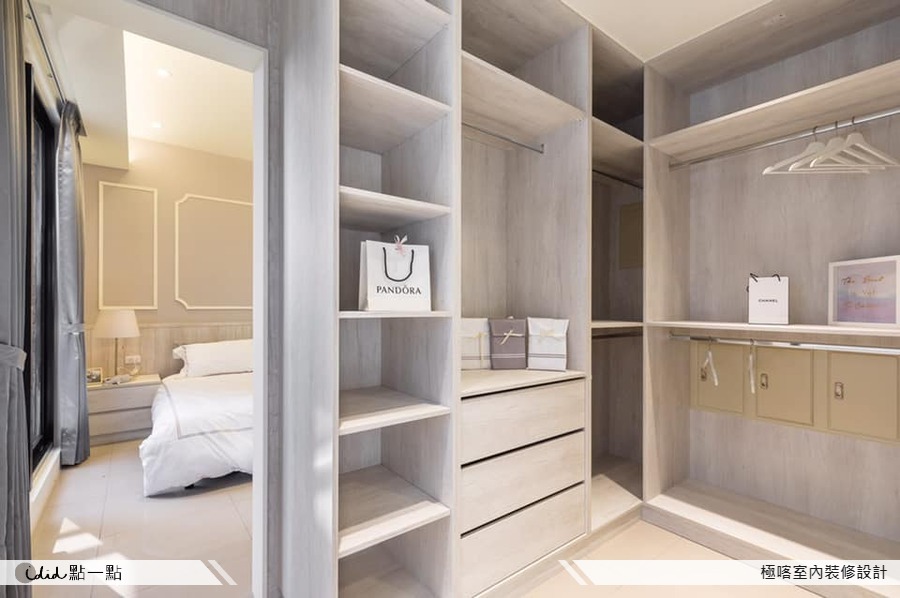 從公共空間到臥室,設計師逐次增加古典風線板的使用,以及淺色木紋牆裙,為空間添入些許貴氣,滿足居住者對生活的美好想像;而寬闊的更衣間及收納設計,則讓這些『美好』有了安放之地。