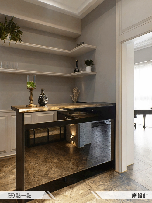 此案使用倒敘的手法,已經定調的風格,包括傢具、燈飾皆被指定,在這樣的基礎下,迎接業主理念,改以「畫面」的概念去構築空間的無限想像,操作上透過一個個端景的呈現把原本零碎的古典元素串起。