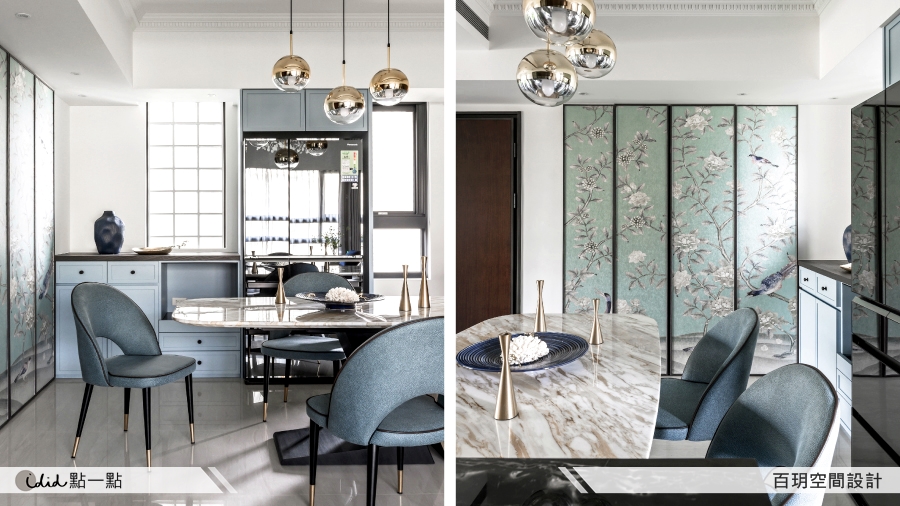餐櫃與一旁隱藏櫃,進口壁紙和哥倫比亞藍乾淨俐落的搭配,摒棄了繁冗,洋溢著混搭新韻。讓我們在台北市快節奏的喧囂環境中,體驗在家靜下心來度假的美好。