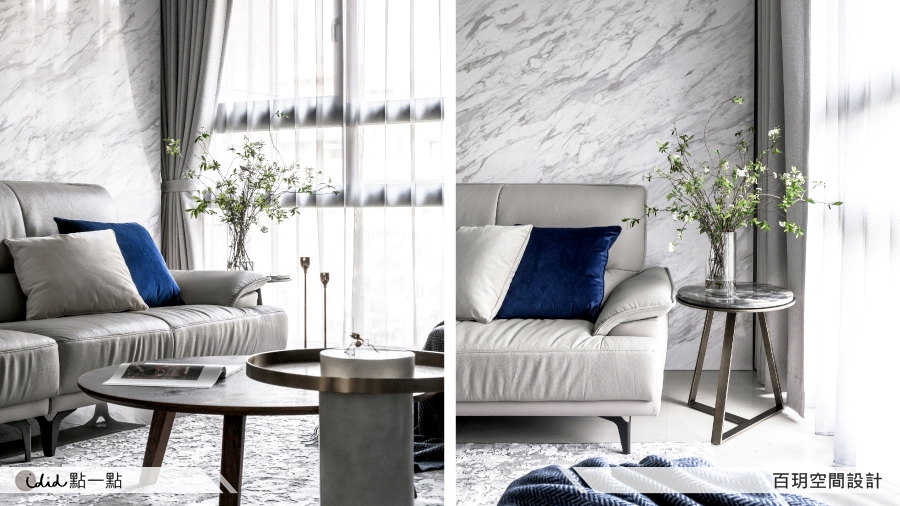 入居映入眼簾的,即是如詩畫般大理石和強大收納空間的客廳電視牆,此種毫無高深櫃壓迫感,卻又擁有著舒緩心靈的神秘力量,是設計師勾勒出精確的線條分割和合理空間運用的視覺景象。