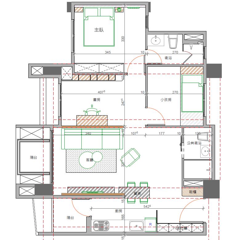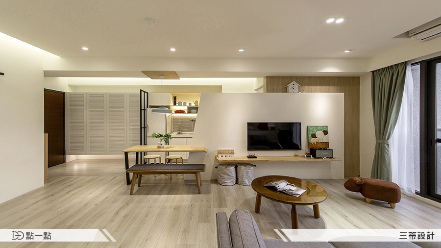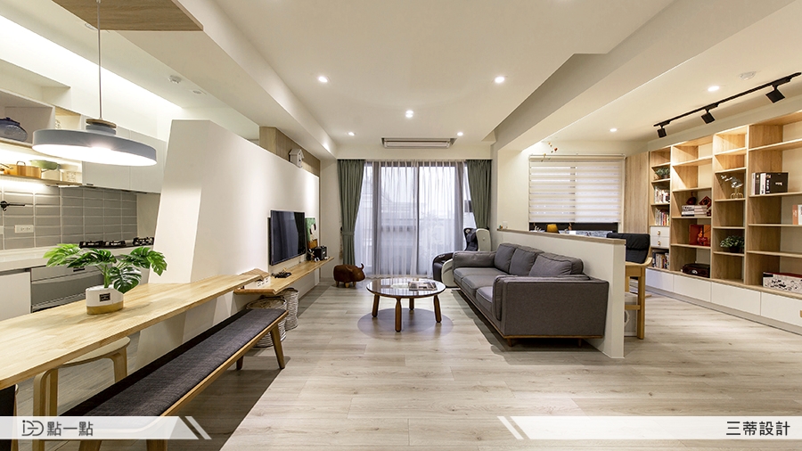 由於房子本身的採光條件相當充沛,為了讓公共空間更加寬廣,因此將原3房拆除1面牆後,以半開放矮牆的設計結合多功能書房。讓整體空間視覺上一覽無遺,打造出十足開敞的空間。