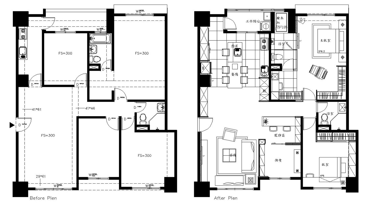 本案為女主人+1小孩的使用空間,因家庭成員只有兩人,當初購屋時原空間為4房2廳;廚房小、房間數過多;經過跟業主討論後,設計師將空間局部打散,重新有效分配出小書房、佛堂並清楚界定出公私領域空間。