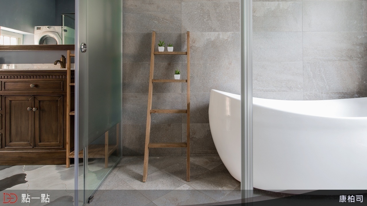 浴缸區大面積以板岩磚呈現,淋浴區則使用復古磚,界定出不同的機能領域。