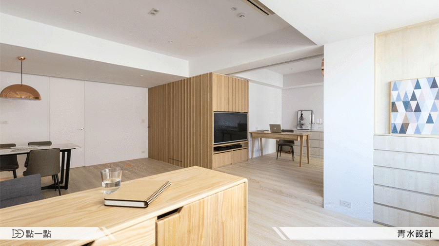 一間40年的老屋,保有既開放又彈性的公共空間,開闊的場域及採光讓動線隨著生活變換,隱藏式的門片延伸牆面造型簡化立面線條,旋轉式影音設備隨處都是我的撥放區,生活就該這樣隨心所欲。