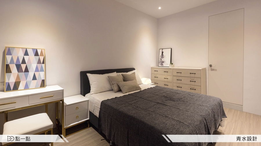 主臥室透過系統衣櫃及現品家具滿足收納需求,透過色系搭配保有乾淨舒適的氛圍。