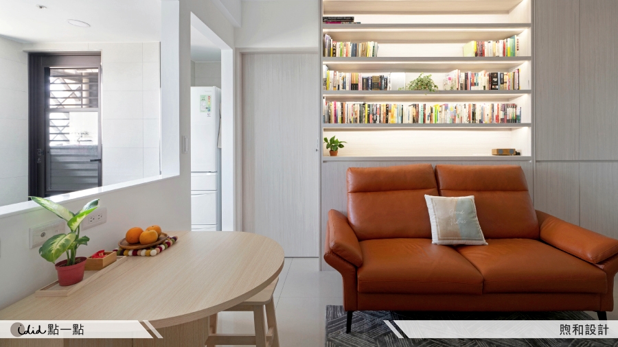 任職於教職業的業主十分喜愛閱讀,也有收藏書籍的習慣。針對此項需求,設計師將設計主軸定調在沙發背牆的大書櫃。利用燈條光線擴大空間感,既可滿足大量陳列書籍亦有展示的作用。