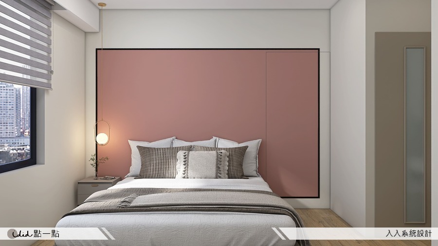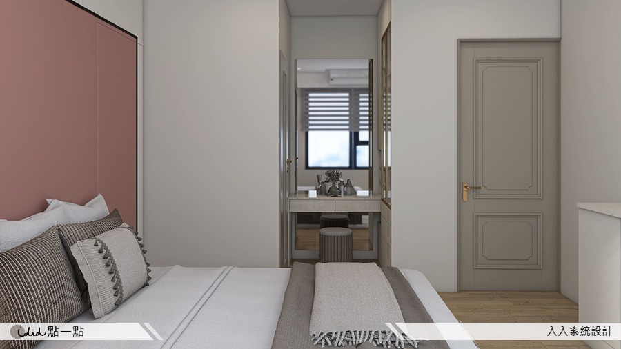 主要使用系統板製作的系統家具,這些家具呈現輕奢風格,利用金屬線條和細緻的線板,以及大理石紋等元素,創造出典雅的設計。主臥室延續了公共區域的設計風格,並增添了粉紅色的視覺元素,為女主人打造了一個充滿浪漫氛圍的環境。而其他兩間臥室則根據居住者的個性,選用了莫蘭迪藍或綠色系,這些色彩在空間中疊加出不同的層次,賦予了臥室獨特的風格。