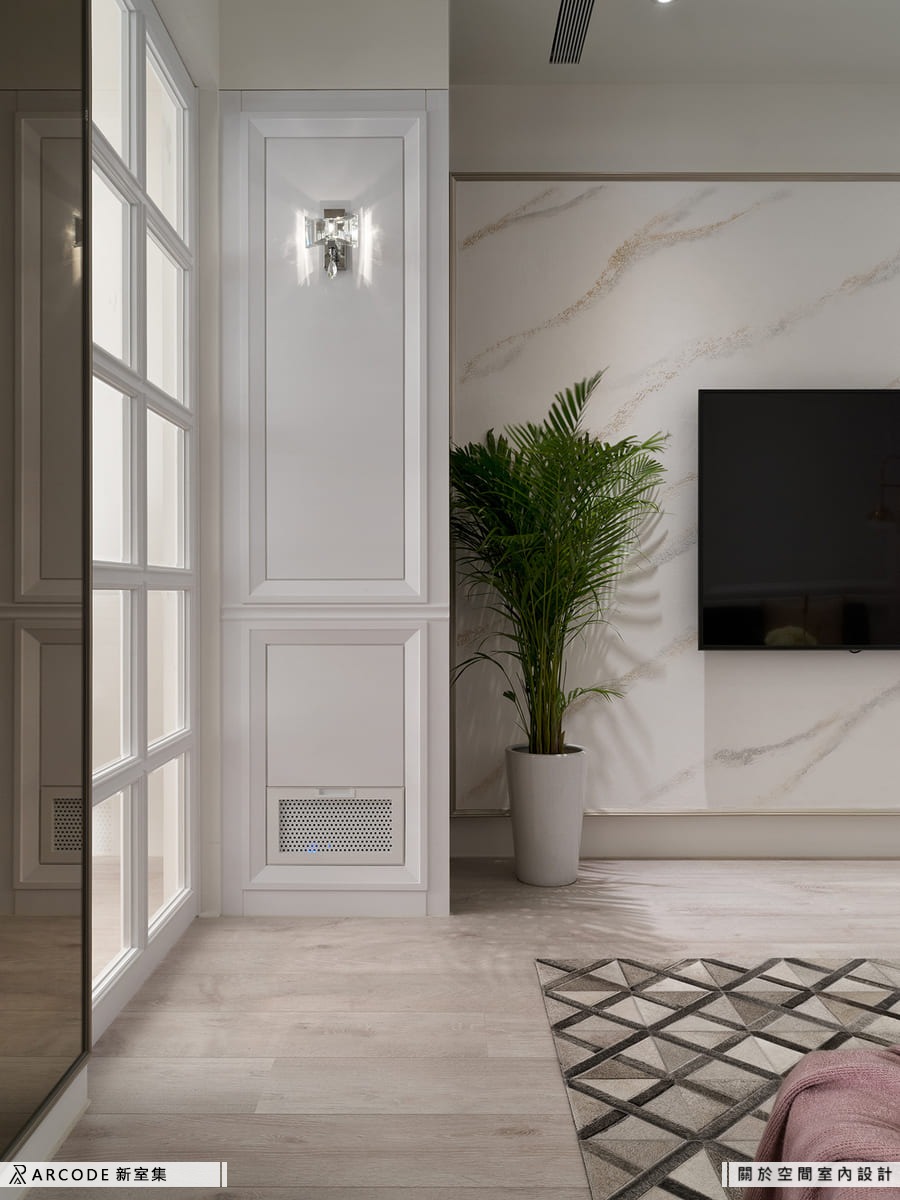 全室採用簡約線條貫穿動線,透過義大利特殊漆、茶鏡與造型門板等異材質交錯鋪陳,形塑出低調而細緻的混搭語彙。主體色調選擇溫潤純白,搭配六角拼花磁磚與德國超耐磨木地板,在冷暖之間取得平衡,讓空間自帶節奏與溫度。